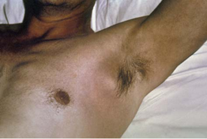 Plague patient with enlarged axillary lymph node, or bubo, characteristic of bubonic plague
