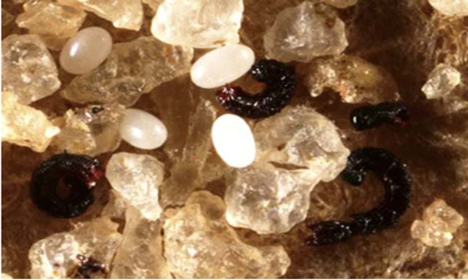 Eggs (ova) and dried blood-rich feces (“flea dirt”) excreted and provisioned as larval food by adults of the cat flea (Cteno cephalides felis)